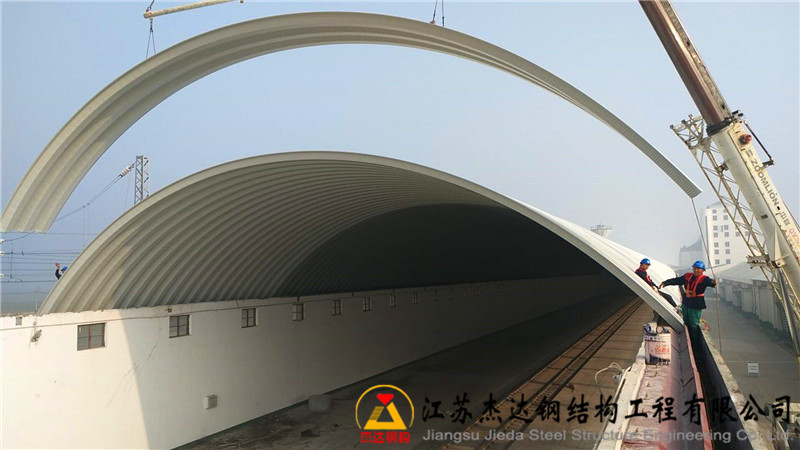 該拱形屋頂設(shè)計合理,跨度和拱高比例協(xié)調(diào),滿足儲糧防護(hù)的實際需求。采用預(yù)埋鐵板與化學(xué)螺栓結(jié)合的方式,確保結(jié)構(gòu)連接的穩(wěn)定性和安全性。彩涂卷材質(zhì)優(yōu)良,耐候性強,適合長期戶外使用。