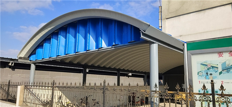 本次施工的是一座拱形屋頂罩棚,跨度為7米,長度為30米,總面積約200平方米。該工程不僅涉及拱形屋面的安裝,還包括鋼結(jié)構(gòu)的翻新與托板焊接作業(yè),現(xiàn)場工序安排合理,確保在3天內(nèi)順利完成。